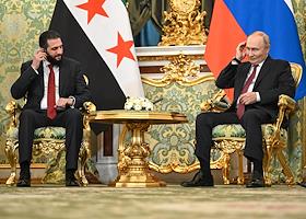 Российско-сирийские переговоры в Кремле. Президент России Владимир Путин (справа) и президент Сирии Ахмед аш-Шараа во время переговоров.
