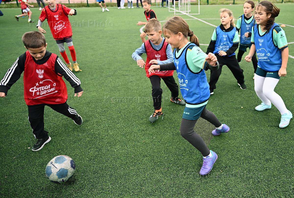 Трофи-тур FONBET Кубка России перед центральным матчем пятого тура Пути регионов FONBET Кубка России между командами "Черноморец" (Новороссийск) – "Кубань Холдинг" (Павловская). Посещение средней общеобразовательной школы №34 имени Н.К.Божененко амбассадорами Российского футбольного союза (РФС), футболистами Дмитрием Аленичевым и Егором Титовым, сопровождающими трофей FONBET Кубка России. Учащиеся школы во время игры в футбол.