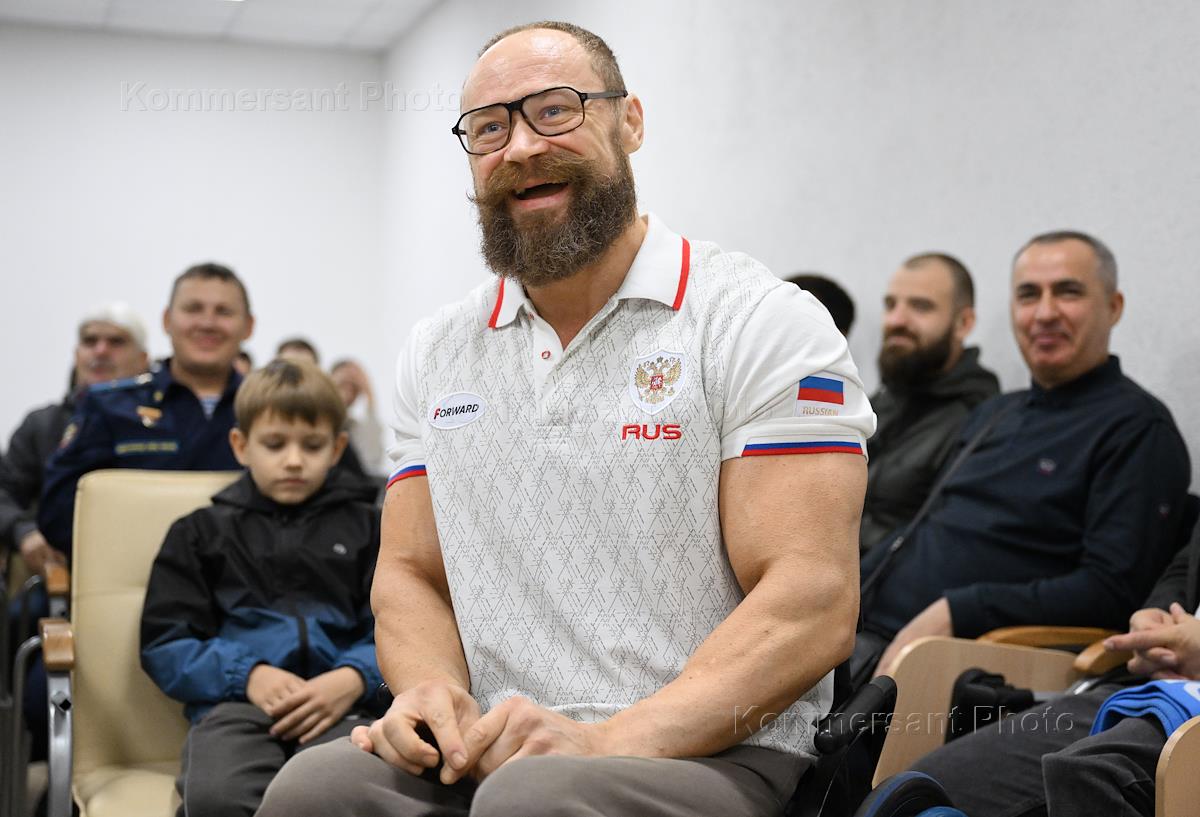 Трофи-тур FONBET Кубка России перед центральным матчем пятого тура Пути регионов FONBET Кубка России между командами "Черноморец" (Новороссийск) – "Кубань Холдинг" (Павловская). Встреча амбассадоров Российского футбольного союза (РФС), футболистов Дмитрия Аленичева и Егора Титова, сопровождающих трофей FONBET Кубка России к месту проведения матча, с членами Физкультурно-спортивного клуба инвалидов "Второе дыхание". Чемпион мира по бодибилдингу среди спортсменов-колясочников Владимир Артамонов во время встречи.