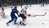 Континентальная Хоккейная Лига (КХЛ). Матч между командами "Барыс" (Астана) - "Авангард" (Омск) на стадионе "Барыс-Арена". Игрок команды "Барыс" Вячеслав Колесников (в центре) во время матча.