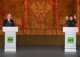 Празднование 20-летия международного телеканала RT (Russia Today) в Государственном академическом Большом театре. Президент России Владимир Путин (слева) и главный редактор телеканала RT, главный редактор международного информационного агентства "Россия сегодня" Маргарита Симоньян (справа) во время празднования.