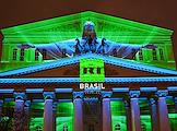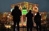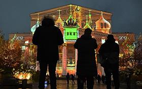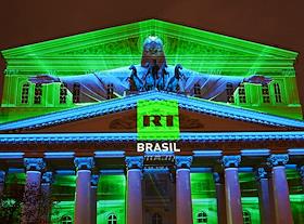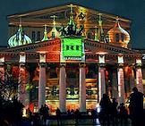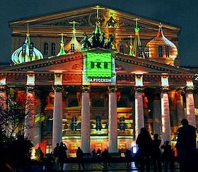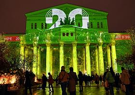 Празднование 20-летия международного телеканала RT (Russia Today) в Государственном академическом Большом театре. Световая 3D-проекция на фасаде Большого театра.