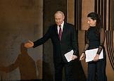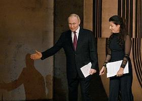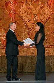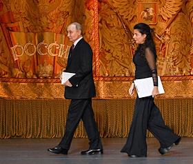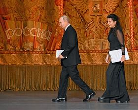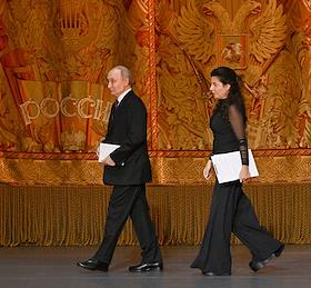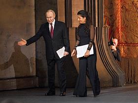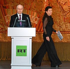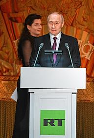 Празднование 20-летия международного телеканала RT (Russia Today) в Государственном академическом Большом театре. Президент России Владимир Путин (слева) и главный редактор телеканала RT, главный редактор международного информационного агентства "Россия сегодня" Маргарита Симоньян (в центре) во время празднования.