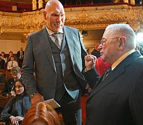 Празднование 20-летия международного телеканала RT (Russia Today) в Государственном академическом Большом театре. Первый заместитель председателя комитета Государственной думы России по туризму и развитию туристической инфраструктуры Николай Валуев (слева) и артист эстрады Евгений Петросян (справа) во время празднования.