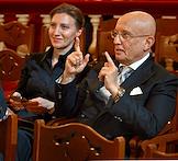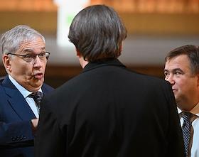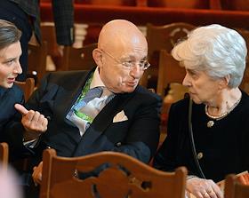 Празднование 20-летия международного телеканала RT (Russia Today) в Государственном академическом Большом театре. Политолог, научный руководитель факультета мировой экономики и мировой политики НИУ ВШЭ Сергей Караганов (в центре) и президент Русского общественного фонда Александра Солженицына Наталья Солженицына (справа) во время празднования.