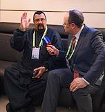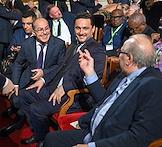 Церемония празднования 20-летия международного телеканала RT (Russia Today) в Государственном академическом Большом театре (ГАБТ) России. Военкор и политический обозреватель телеканала RT Arabic Саргон Хадая (в центре) и ведущий телеканала RT Arabic Салям Мосафир (справа) на церемонии.