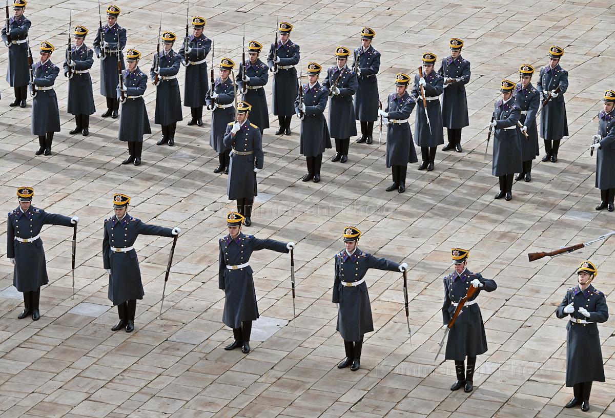 Церемония развода пеших и конных караулов Президентского полка ФСО России на Соборной площади Московского Кремля. Военнослужащие Президентского полка во время церемонии.