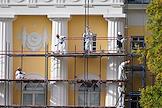 Церемония развода пеших и конных караулов Президентского полка ФСО России на Соборной площади Московского Кремля. Жанровая фотография. Рабочие во время ремонта фасада Сенатского дворца Московского Кремля.