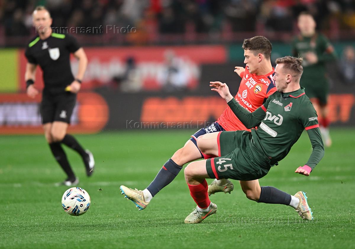 Мир Российская Премьер-Лига (РПЛ) 2025/2026. 12-й тур. Матч между командами "Локомотив" (Москва) - ЦСКА (Москва) на стадионе "РЖД Арена". Игрок команды "Локомотив" Александр Руденко (справа) и игрок команды ЦСКА Игорь Дивеев (в центре) во время матча.