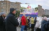 Церемония освящения храма Святого великомученика Георгия Победоносца — главного храма Южного военного округа, возведенном в Западном микрорайоне Ростова-на-Дону. Люди перед храмом во время церемонии.