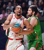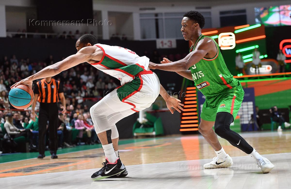 Единая лига ВТБ по баскетболу. Матч между командами УНИКС (Казань) - "Локомотив-Кубань" (Краснодар) на спортивной арене "Баскет-холл". Игрок команды "Локомотив-Кубань" Патрик Миллер (слева) во время матча.