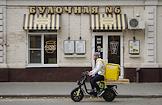 Жанровая фотография. Здание "Булочной № 6". Курьер по доставке еды на электровелосипеде.