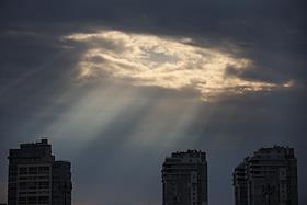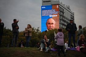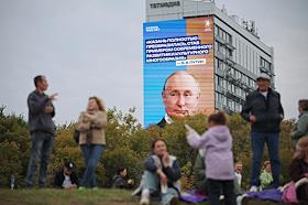 Виды Казани. Жанровая фотография. Портрет президента России Владимира Путина на светодиодном экране, установленном на торце здания медиакомпании "Татмедиа".