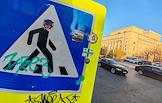 Виды Казани. Жанровая фотография. Дорожный знак "пешеходный переход" на фоне здания Татарского театра оперы и балета имени Мусы Джалиля.