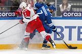 Континентальная Хоккейная Лига (КХЛ). Матч между командами "Динамо" (Москва) - "Локомотив" (Ярославль) на стадионе "ВТБ Арена". Игрок команды "Локомотив" Алексей Береглазов (слева) и игрок команды "Динамо" Даниил Прохоров (справа) во время матча.