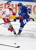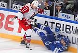 Континентальная Хоккейная Лига (КХЛ). Матч между командами "Динамо" (Москва) - "Локомотив" (Ярославль) на стадионе "ВТБ Арена". Игрок команды "Локомотив" Рихард Паник (слева) и игрок команды "Динамо" Артем Ильенко (справа) во время матча.