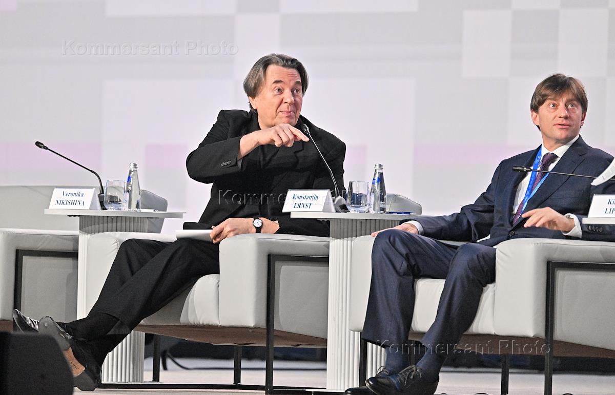 Международный экспортный форум "Сделано в России" в национальном центре "Россия". Пленарная дискуссия "Россия – миру. Укрепляя доверие, развивая глобальные связи". Генеральный директор телекомпании "Первый канал" Константин Эрнст (слева) и генеральный директор АО "Трансмашхолдинг" Кирилл Липа (справа) во время дискуссии.