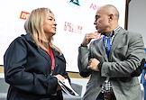 III Национальный съезд учебной промышленности "УЧПРОМ 2025" в конгресс-центре особой экономической зоны (ОЭЗ) "Технополис Москва". Заместитель руководителя Департамента инвестиционной и промышленной политики города Москвы Владимир Петраков (слева) и заместитель руководителя Департамента образования и науки города Москвы Александра Корнеева (справа) во время съезда.