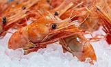 Выставка рыбной индустрии, морепродуктов и технологий Seafood Expo в конгрессно-выставочном центре "Экспофорум". Жанровая фотография. Креветки на льду на стенде участника выставки.