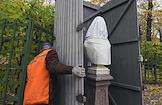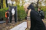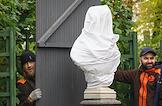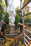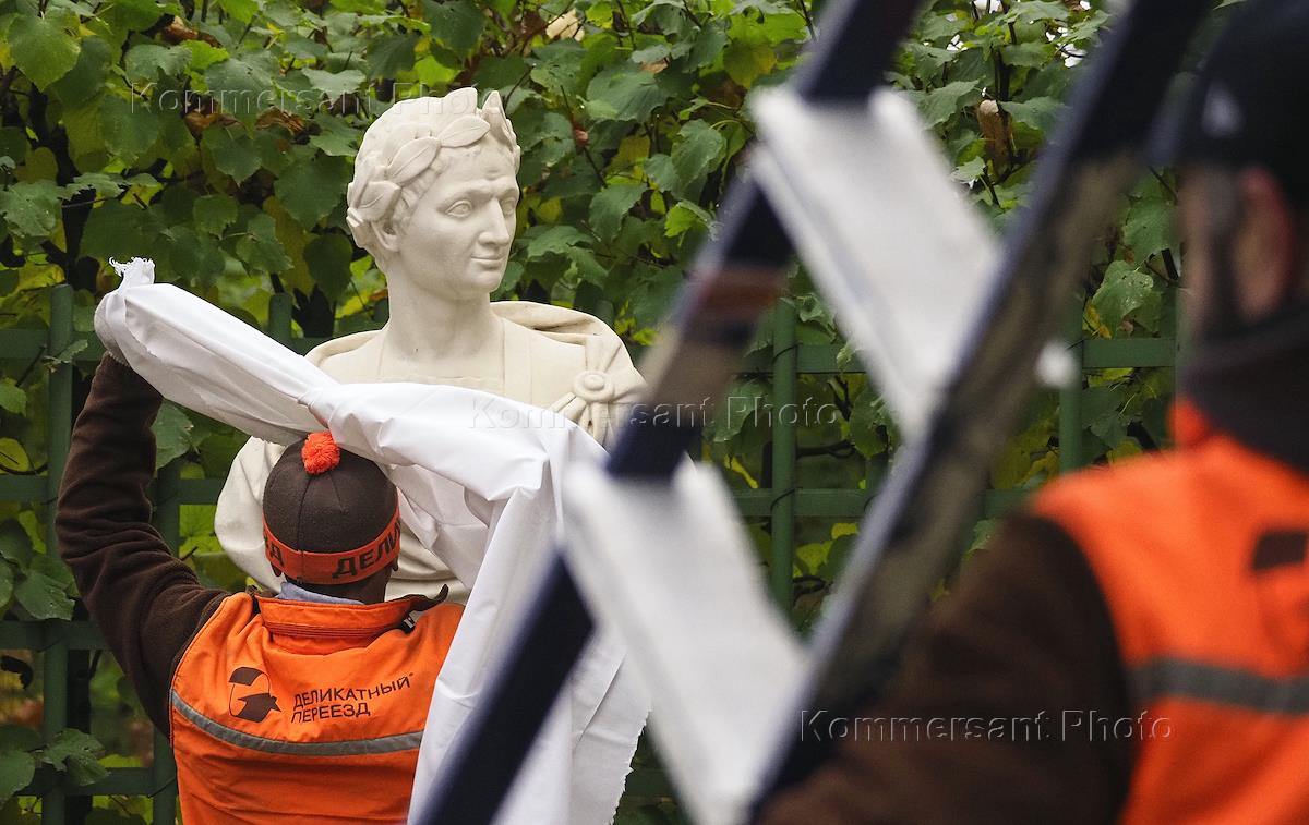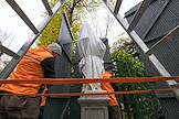 Виды Санкт-Петербурга. Жанровая фотография. Сотрудники мувинговой компании "Деликатный переезд" во время укрытия скульптур тканью и деревянными футлярами на зимний период.