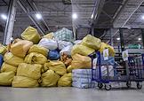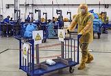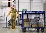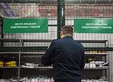 Учение по пресечению перемещения в посылках товаров, загрязненных радионуклидами, в Логистическом центре "Почты России" в Татарстане. Жанровая фотография. Место хранения задержанных товаров.