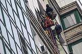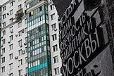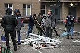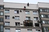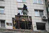 Последствия атаки БПЛА в жилом комплексе (ЖК) "Изумрудные холмы". Сотрудники коммунальной службы убирают разбитые оконные рамы на тротуаре у здания ЖК.