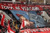 Континентальная Хоккейная Лига (КХЛ). Матч между командами "Спартак" (Москва) - "Динамо" (Москва) на стадионе "Мегаспорт". Болельщики команды "Спартак" на трибуне во время матча.