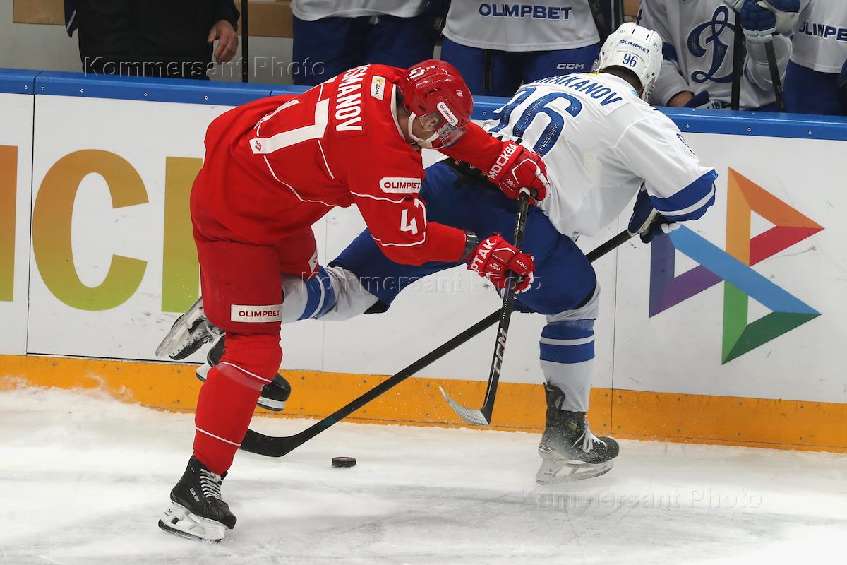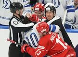 Континентальная Хоккейная Лига (КХЛ). Матч между командами "Спартак" (Москва) - "Динамо" (Москва) на стадионе "Мегаспорт". Игрок команды "Спартак" Даниэль Усманов и игрок команды "Динамо" Магомед Шараканов (справа) во время матча.