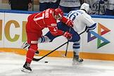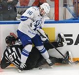 Континентальная Хоккейная Лига (КХЛ). Матч между командами "Спартак" (Москва) - "Динамо" (Москва) на стадионе "Мегаспорт". Игрок команды "Динамо" Магомед Шараканов (справа) во время матча.