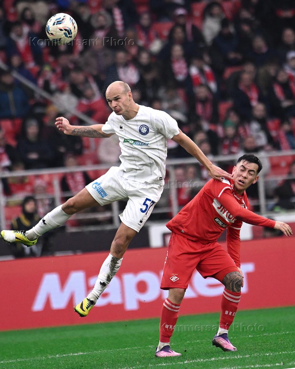 Мир Российская Премьер-Лига (РПЛ) 2025/2026. 13-й тур. Матч между командами "Спартак" (Москва) - "Оренбург" (Оренбург) на стадионе "Лукойл Арена". Игрок команды "Спартак" Игорь Дмитриев (справа) во время матча.