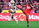 Мир Российская Премьер-Лига (РПЛ) 2025/2026. 13-й тур. Матч между командами "Спартак" (Москва) - "Оренбург" (Оренбург) на стадионе "Лукойл Арена". Игрок команды "Спартак" Кристофер Мартинс (слева) и игрок команды "Оренбург" Ацамаз Ревазов (справа) во время матча.