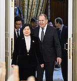Переговоры министра иностранных дела России Сергея Лаврова и министра иностранных дел КНДР Сон Хи Цой в особняке МИД России. Министр иностранных дел России Сергей Лавров (в центре) и министр иностранных дел КНДР Сон Хи Цой (вторая слева) перед началом переговоров.