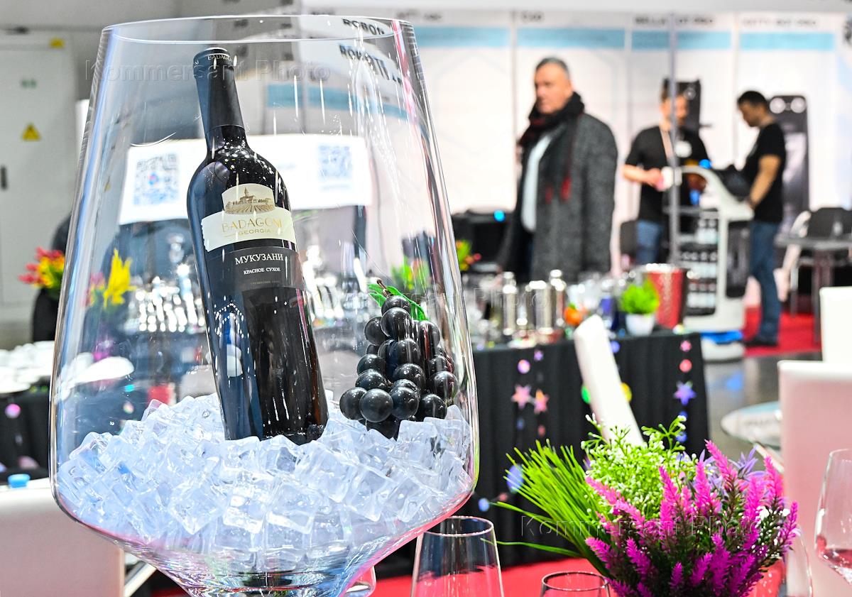 Международная выставка индустрии гостеприимства "ПИР Экспо" в Международном выставочном центре (МВЦ) "Крокус Экспо". Бутылка вина Мукузани грузинской компании Badagoni.
