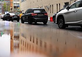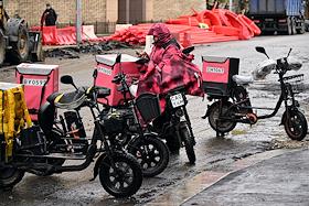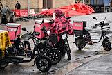 Виды Москвы. Жанровая фотография. Электровелосипеды компании "Самокат" на краю проезжей части 1-й Брестской улицы.