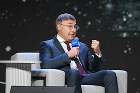 Просветительский марафон "Знание.Наука" в Национальном центре "Россия". Генеральный директор Общества "Знание" Максим Древаль во время выступления на марафоне.
