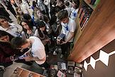 Просветительский марафон "Знание.Наука" в Национальном центре "Россия". Жанровая фотография. Участники марафона у стойки с книгами.