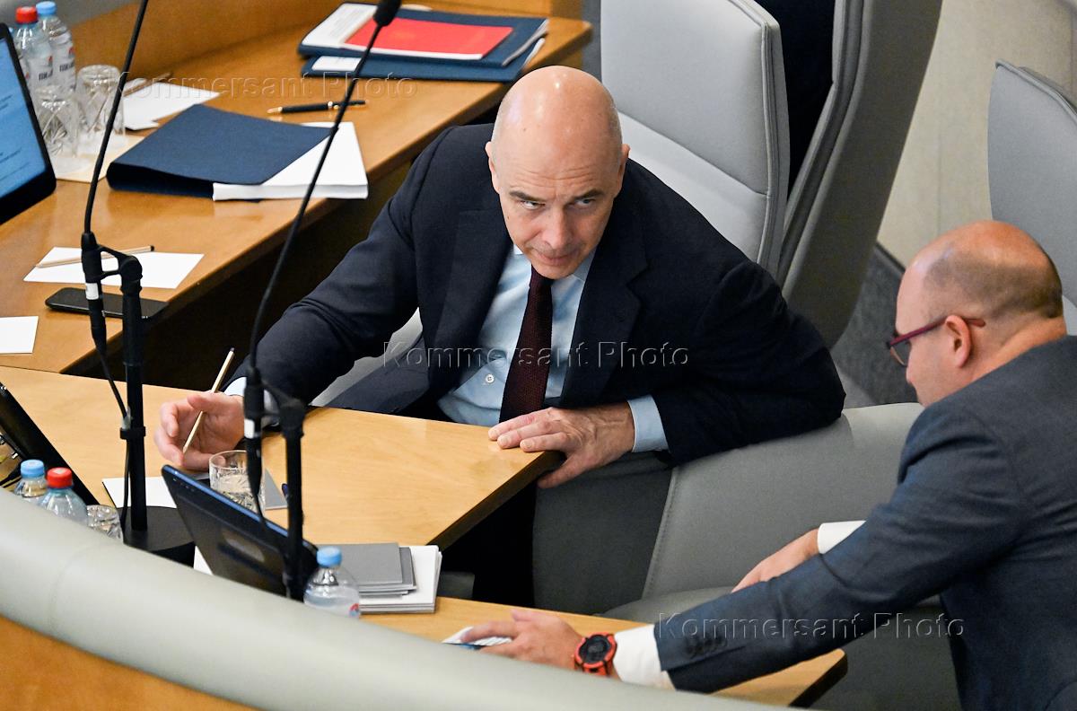 Пленарное заседание Государственной думы (ГД) России. Министр финансов России Антон Силуанов (слева) во время заседания.