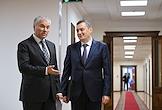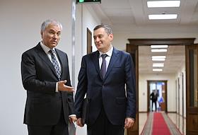Пленарное заседание Государственной думы (ГД) России. Председатель ГД России Вячеслав Володин (слева) и губернатор Курской области Александр Хинштейн перед началом заседания.
