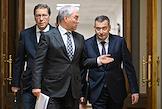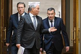 Пленарное заседание Государственной думы (ГД) России. Слева направо: первый заместитель председателя ГД России Александр Жуков, председатель ГД России Вячеслав Володин и губернатор Курской области Александр Хинштейн перед началом заседания.