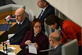 Пленарное заседание Государственной думы (ГД) России. Министр финансов России Антон Силуанов (слева), председатель Центрального Банка России Эльвира Набиуллина (вторая слева) и заместитель председателя Банка России Алексей Заботкин (справа) во время заседания.