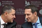 Мероприятия, посвященные малым городам России и приуроченные к годовщине установления маршрута "Золотое кольцо", в доме Российского исторического общества (РИО). Председатель Российского исторического общества, директор Службы внешней разведки Сергей Нарышкин (слева) во время мероприятий.