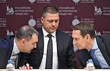 Мероприятия, посвященные малым городам России и приуроченные к годовщине установления маршрута "Золотое кольцо", в доме Российского исторического общества (РИО). Слева направо: заместитель министра строительства и жилищно-коммунального хозяйства России Алексей Ересько, губернатор Псковской области Михаил Ведерников и председатель Российского исторического общества, директор Службы внешней разведки Сергей Нарышкин во время мероприятий.