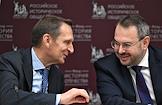 Мероприятия, посвященные малым городам России и приуроченные к годовщине установления маршрута "Золотое кольцо", в доме Российского исторического общества (РИО). Председатель Российского исторического общества, директор Службы внешней разведки Сергей Нарышкин (слева) и заместитель министра науки и высшего образования России Константин Могилевский (справа) во время мероприятий.