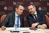 Мероприятия, посвященные малым городам России и приуроченные к годовщине установления маршрута "Золотое кольцо", в доме Российского исторического общества (РИО). Заместитель министра строительства и жилищно-коммунального хозяйства России Алексей Ересько (слева) и губернатор Псковской области Михаил Ведерников (справа) во время мероприятий.