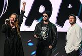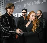 Церемония вручения музыкальной премии "Жара Media Awards" в многофункциональном комплексе "Live Арена". Слева направо: участники группы "Goroda" Екатерина Ковская, Олег Глухов и диджей Леонид Руденко на церемонии.