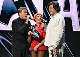 Церемония вручения музыкальной премии "Жара Media Awards" в многофункциональном комплексе "Live Арена". Участники группы "Goroda" Екатерина Ковская (справа) и Владимир Идиатуллин (слева) на церемонии.