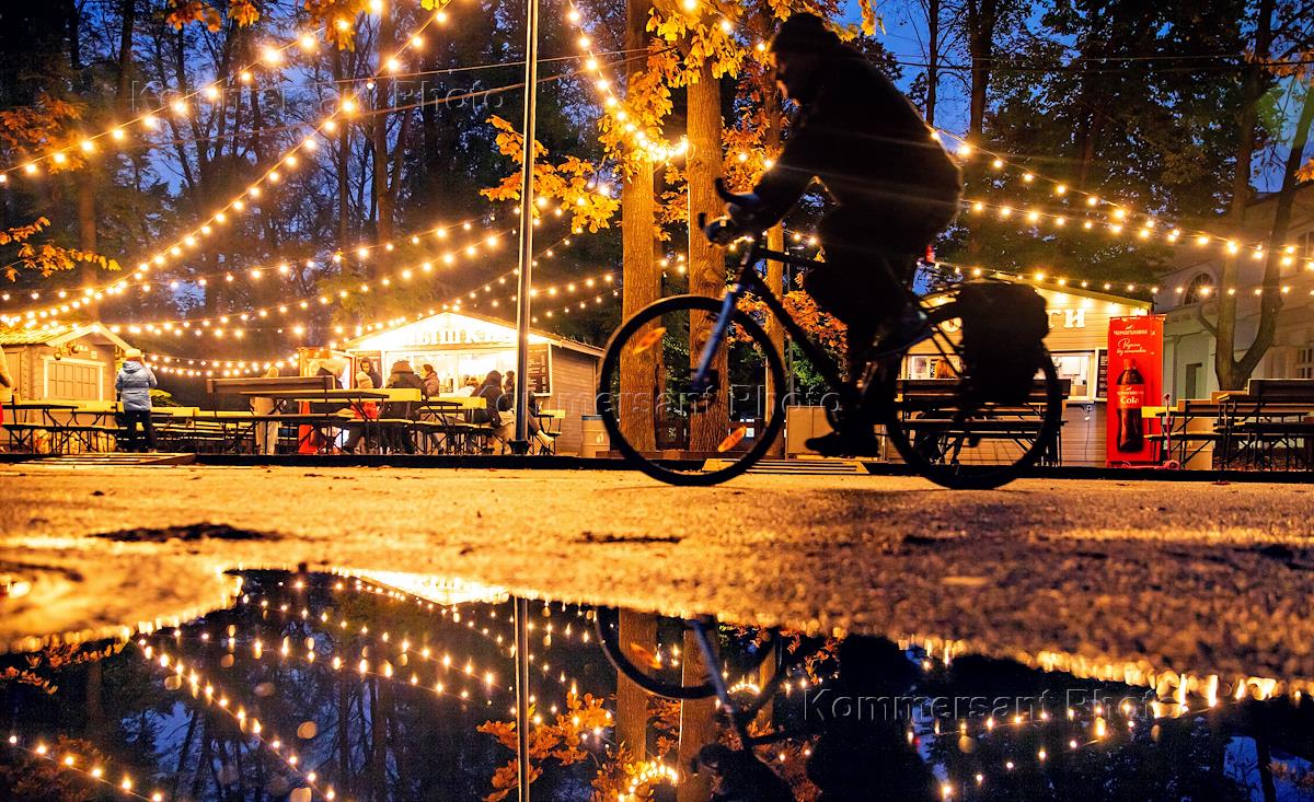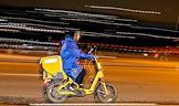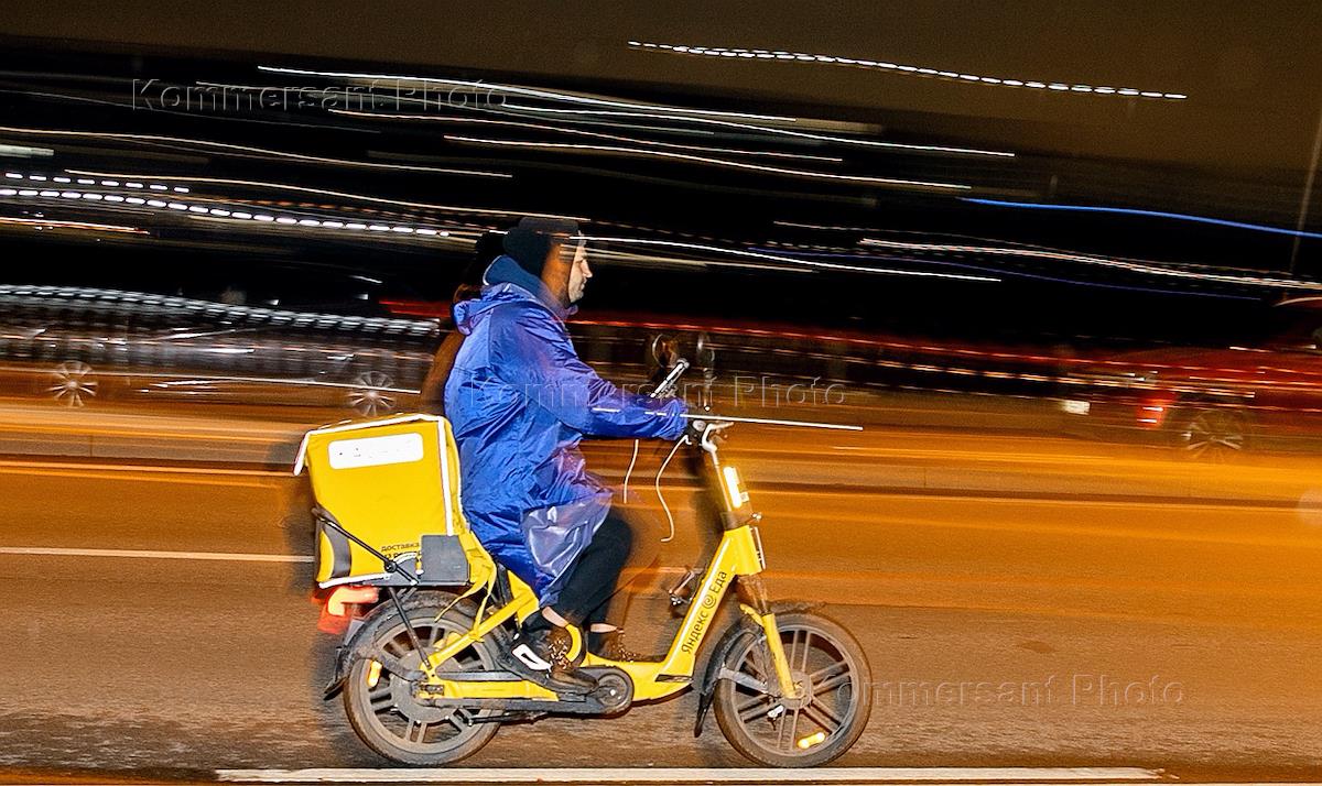 Виды Санкт-Петербурга. Жанровая фотография. Курьер сервиса "Яндекс Еда" на Октябрьской набережной.