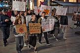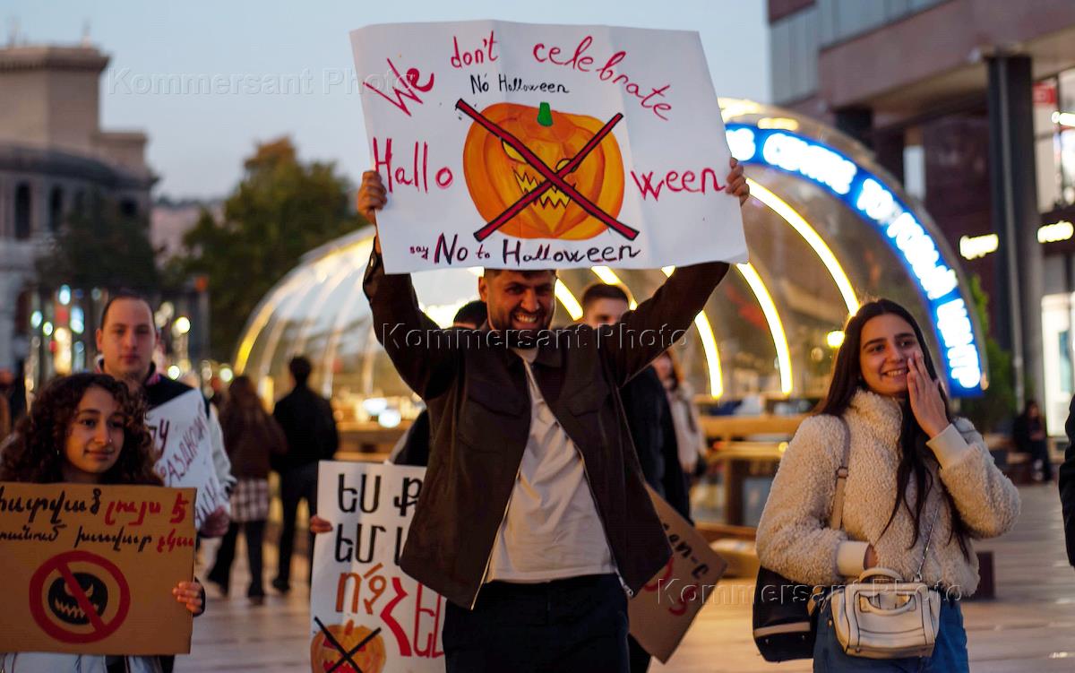 Празднование Хэллоуина в Ереване. Люди в маскарадных костюмах на фоне акции протеста против празднования Хэллоуина. Жанровая фотография.