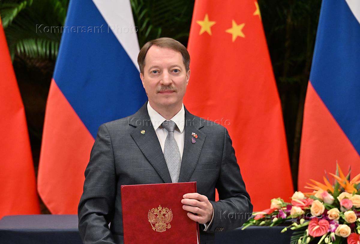 Рабочая поездка председателя правительства России Михаила Мишустина в Китай. Генеральный Директор госкорпорации "Роскосмос" Дмитрий Баканов во время церемонии подписания совместных документов по итогам встречи глав правительств России и Китая на территории государственной резиденции "Сиху".