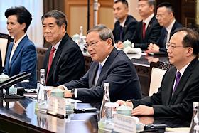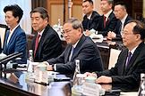 Рабочая поездка председателя правительства России Михаила Мишустина в Китай. Встреча глав правительств России и Китая на территории государственной резиденции "Сиху". Премьер Государственного совета Китайской Народной Республики (КНР) Ли Цян (второй справа) во время встречи.
